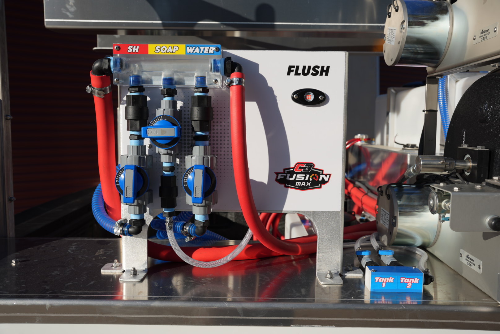 Looking for a high flow metering system for your Comet P40 or AR45 soft wash pump? Look no further than the Fusion MAX. It comes standard with a wireless remote flush option with a light indicator! The C3 Fusion MAX comes with:
